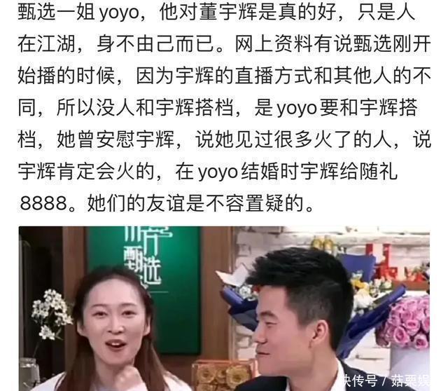当初两个人一起搭档的时候,据说很多主播不和宇辉一起搭档,只有YOYO站出来和宇辉一起,跨年夜直播的时候,宇辉在台下哭,也是YOYO在一旁安慰,他们两个人真的是很好的朋友。